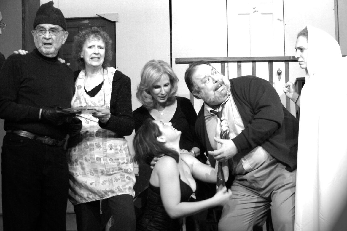 Director Steve Arcidiacono gives his cast plenty of exercise as the actors race up and down stairs and in and out of seven doors, playing actors caught in their own real-life farce while simultaneously trying to keep their onstage farce on its feet. There are moments throughout of admirable choreography and split-second timing that draw not only well-deserved laughs from the audience, but the kind of “oohs” and “aahs” you hear when top-flight dancers execute especially graceful moves. Only in the final act, when the onstage farce hits bottom, does the company’s energy start to flag a bit. Nevertheless, the (real-life) actors seem to be having the time of their lives, and happily, this atmosphere of fun reaches the audience as well. Dan McGlaughlin, as the simultaneously pompous, inarticulate (and, apparently, insanely jealous) Gary, probably made me laugh the most, but all the actors score. In no particular order, Kim Albright is a delight as the harried assistant stage manager with a big secret; Shamus Hunter McCarty is perfectly exasperated as the overworked stage manager/understudy; Michael Tamin Yurcaba provides an appropriately bombastic presence as the director in over his head in more ways than one; Loretta Lucy Miller, as Dotty, somehow manages to make the word “sardines” insanely funny; Nancy Bennett finds plenty of her own ways to be funny as Belinda, the most “reliable” actor; Leigh Jacobs does well by the perpetually apologizing Freddie; Stephanie Weinstein is a hoot as the dim-bulb (and dim-sighted) novice Brooke; and Ben Kendall just has to enter to get his laughs as the never-quite-there Selsdon, the English veteran with equal parts greasepaint and alcohol in his veins.