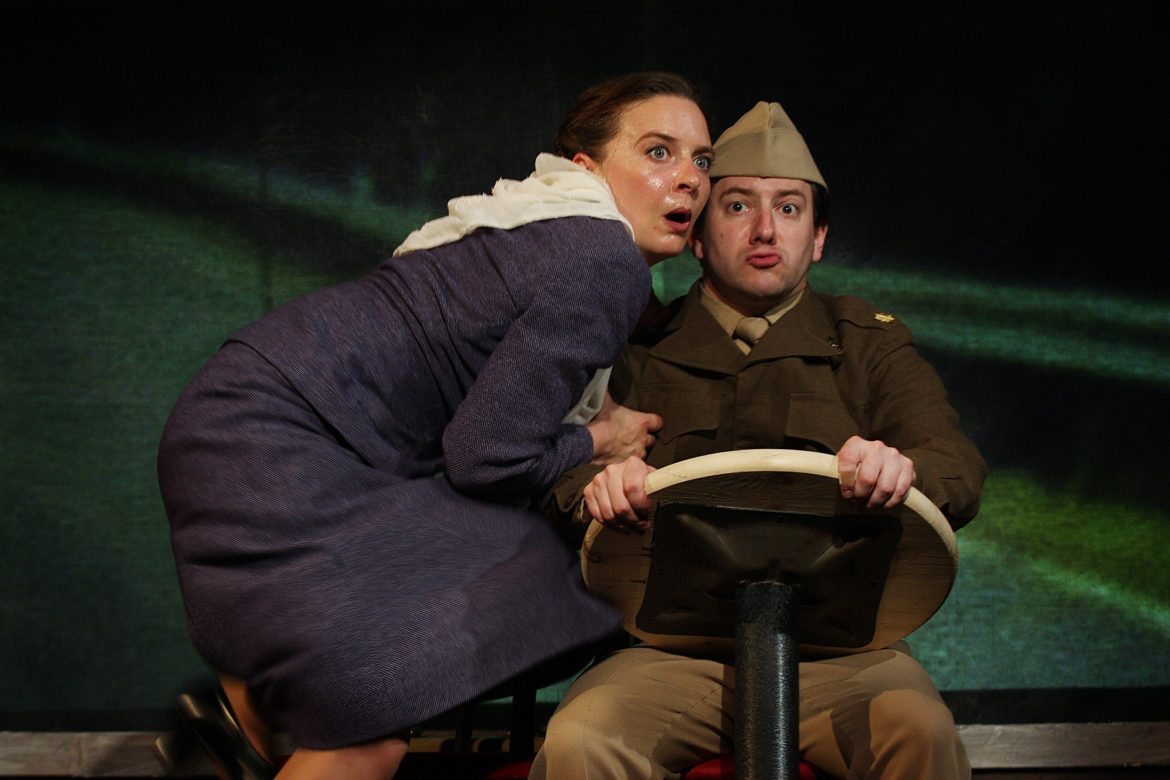 Robert DaPonte as The Soldier, Amanda Grove as Leni Riefenstahl in PLAYING LENI, a Madhouse Theater production. (Photo Credit: Paola Nogueras)