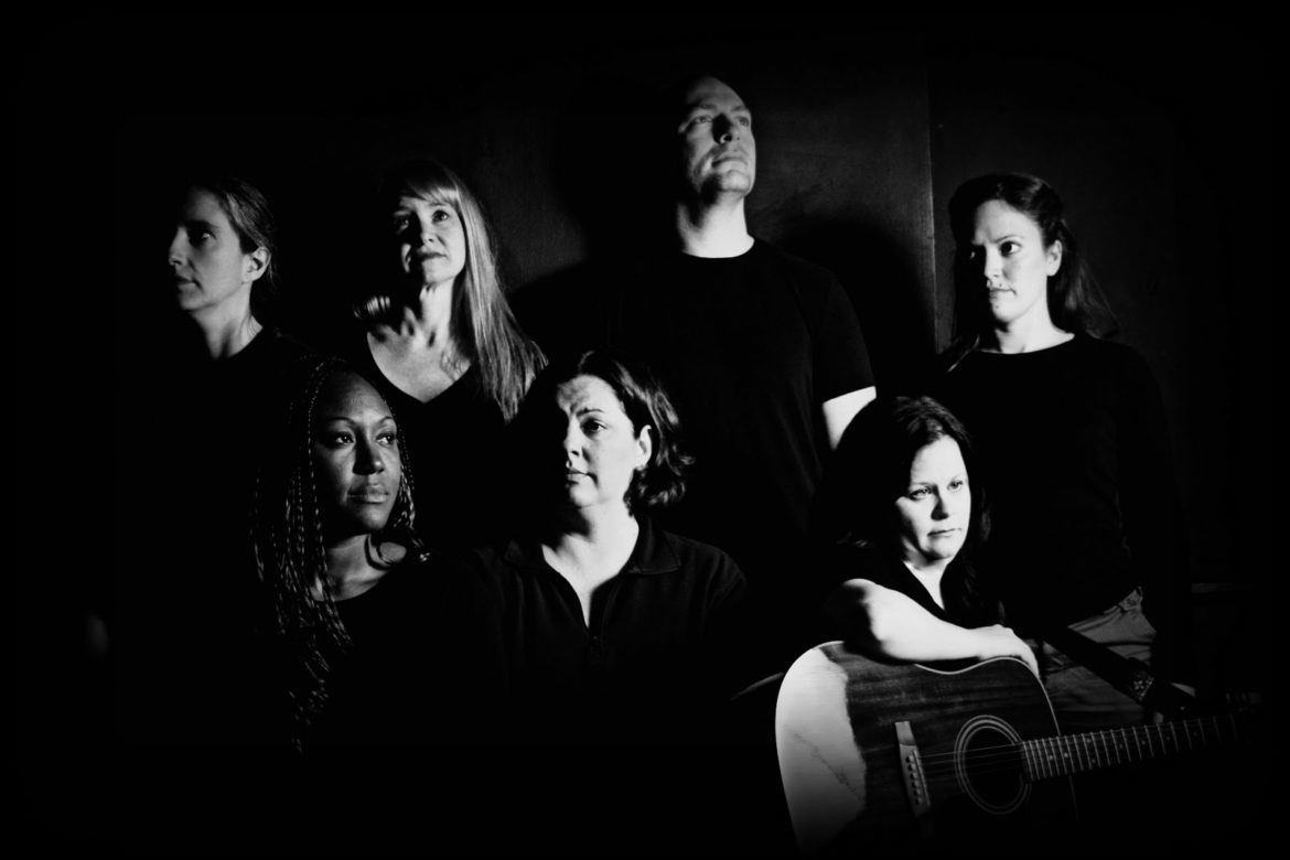 The cast of A PIECE OF MY HEART: (l. to r.) Melissa Shaner (Whitney), Laurie Burke (Sissy), Kevin Robinson (All the American Men), Andrea Grinwis (Leeann); (first row, left to right) Tia Allen (Steele), Bonnie Schuman (Martha), Aimee Kerr (Mary Jo). The Barley Sheaf Players production runs in Lionville, PA through November 12.