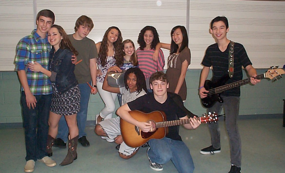 Tanner Mead, Victoria Scialfa, Ryan Strack, Mani Kissling, Kaitlynn Ely, Grace Manno, Madelyn Curtin and Zachary Manno; kneeling, J. Scott, left, and Noah Barson in CAMP ROCK opening at Kelsey Theatre on February 10.