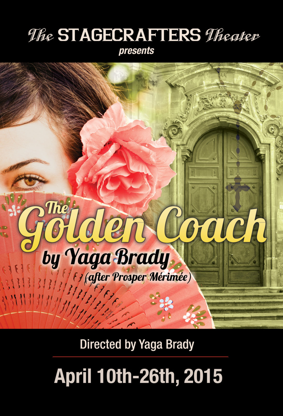 THE GOLDEN COACH, a lusty comedy-farce, adapted by Yaga Brady from the classic play, “Le Carrosse du Saint-Sacrement”, by Prosper Mérimée, opens at The Stagecrafters theater on Friday, April 10, 2015. It is a stylish reincarnation – in a long line of stage and screen versions – of the story of the actress Micaela Perricholi and her lover, the Viceroy of Peru, in the late 1700s, characters based on real-life personages. In this witty romp the spirited and fearless Perricholi fights for her due position in society, taking on the entire lay and religious establishment of the city of Lima. Passions run amok, fueled by this savvy and strong-willed lady who knows what she wants – and is used to getting it! This classic-rooted farce, which pays homage to the actor’s craft, is a romantic comedy for the ages.