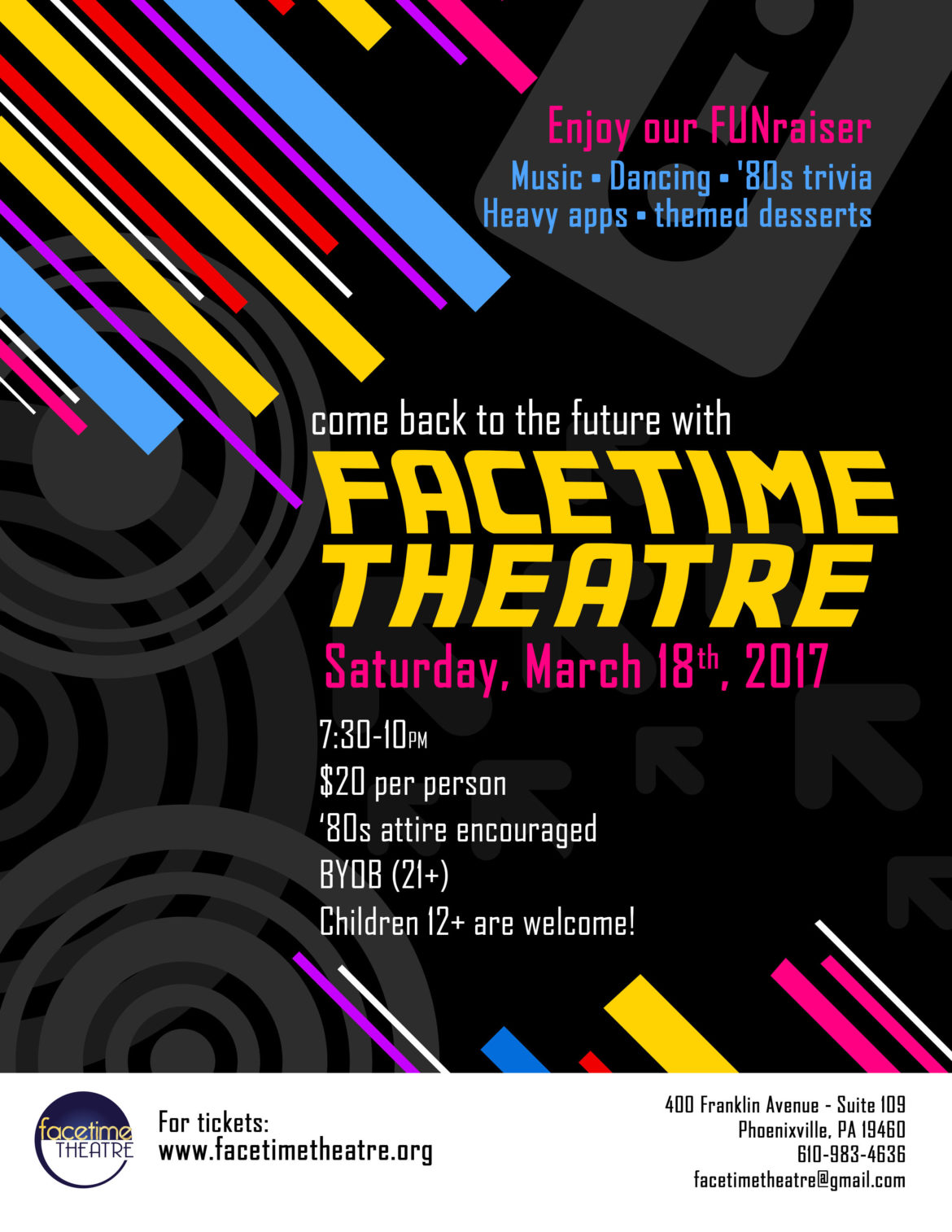 Help us celebrate the recent purchase of our theatre space, look back at some of our most memorable moments and share in the vision for Facetime’s future! Come enjoy our “FUNraiser” and know that your $20 admission fee will help ensure that our future is bright!