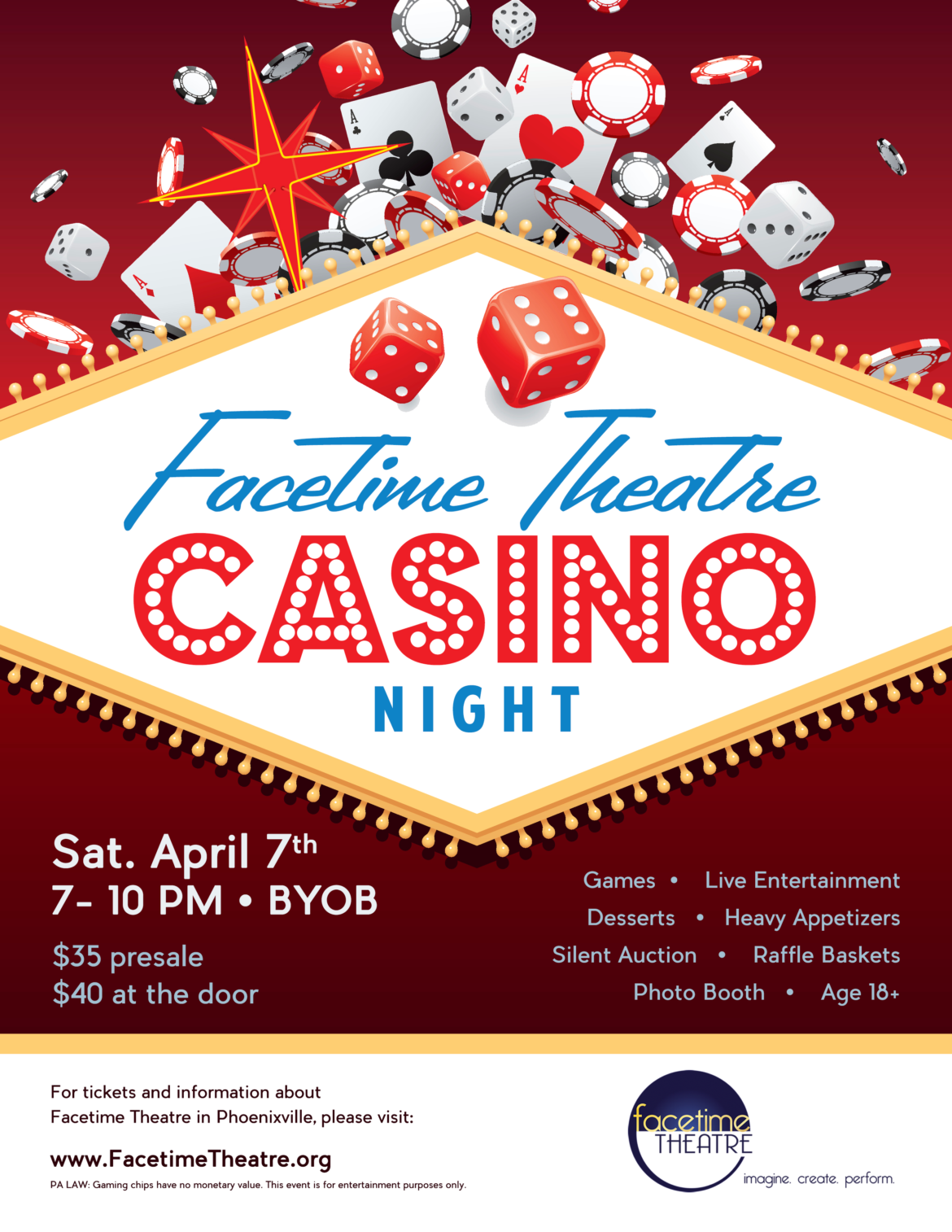 Facetime Theatre is excited to host our CASINO NIGHT fundraiser for the 2018-2019 season and education year – April 7th at 7pm!